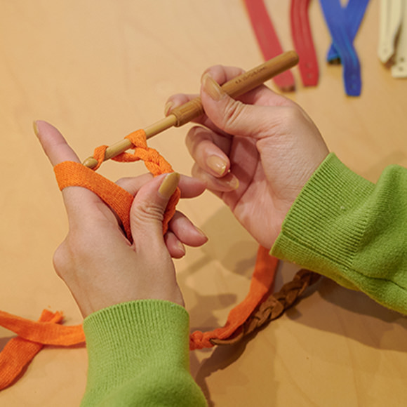 編み物ライフ国産竹の編み針の老舗で体験。編針の歴史レクチャー、オリジナルかぎ針の製作を経て、コーヒータイム。最後はかぎ針で毛糸やレザー素材のバングルを編もう。