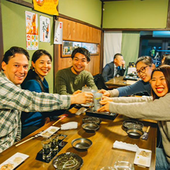 Izakaya Eating Tour地元を盛り上げるため若い世代で結成した「生駒たみ」が企画する、生駒駅周辺の居酒屋グルメ食べ歩きツアー。日本の飲みニケーション文化に触れる交流型体験。