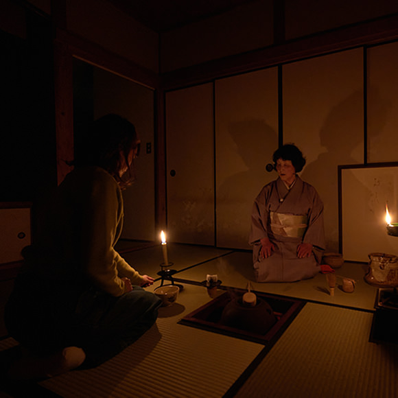 特別体験夜咄(よばなし)とは夜に和ろうそくの灯りだけで行われる特別な茶事。厳かな雰囲気の中、茶懐石、お抹茶などで茶の湯の文化を体験できる。作法の初心者も歓迎。